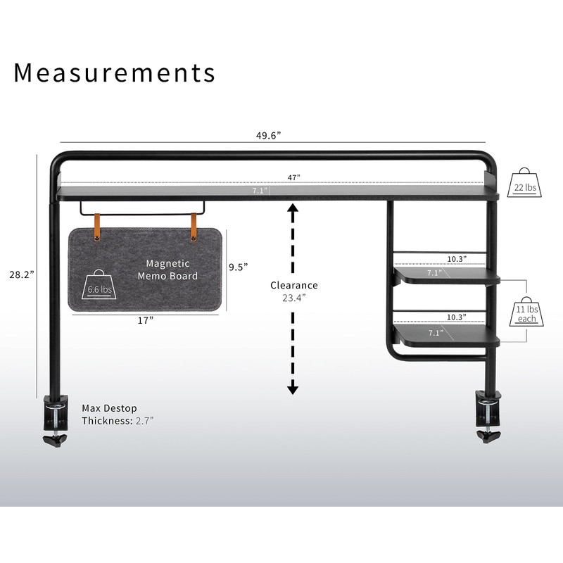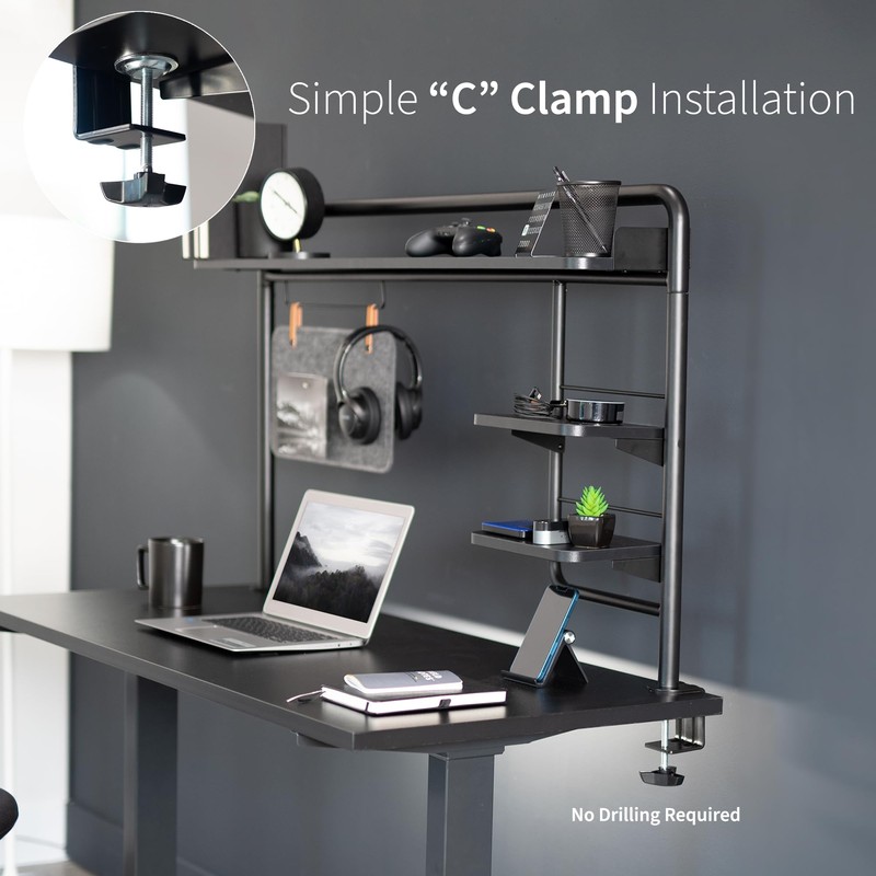 - Clamp-on Design - Heavy-duty C-clamps hold the shelving system securely in place without damaging your desktop (fits desks up to 2.7 in thickness). No drilling or tools are required for installation, and the clamps contain padding to protect your table surface.