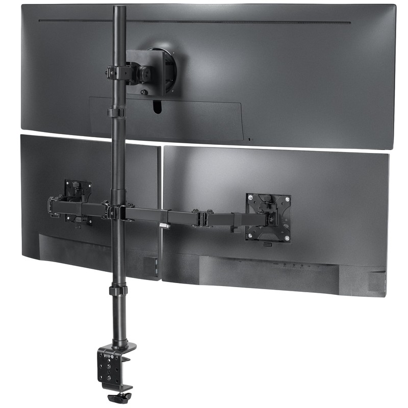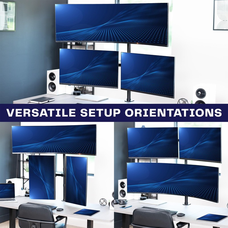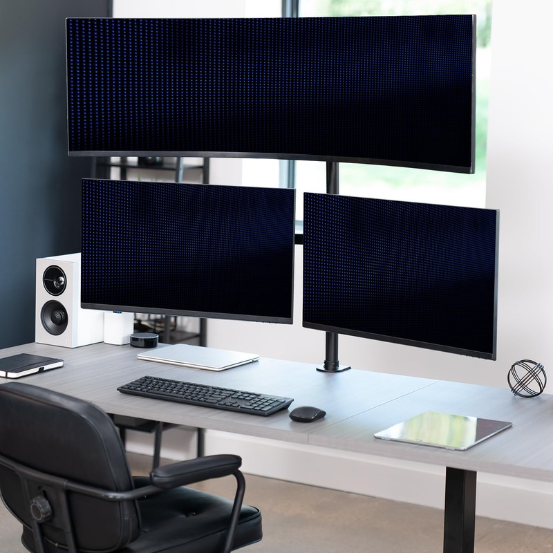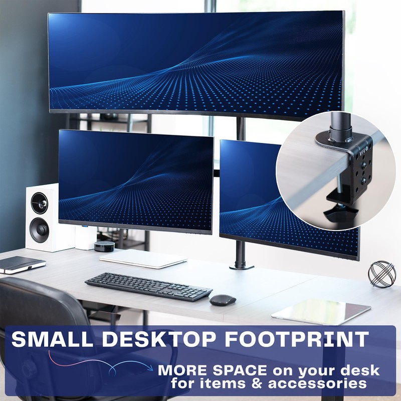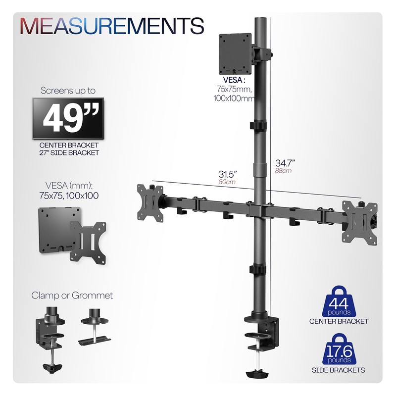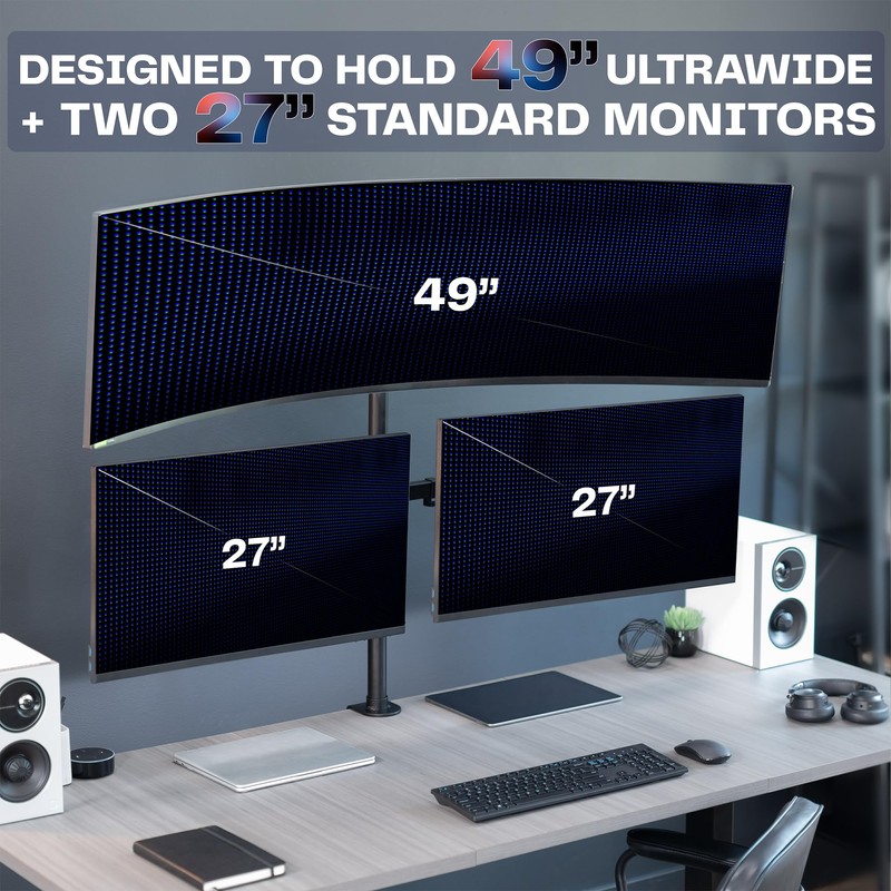 - Triple Monitor Desk Mount: Fits 1 ultra-wide (up to 49) on center bracket and 2 standard screens (up to 27) on each side bracket with VESA 75x75mm or 100x100mm mounting holes. Holds up to 44 lbs on center bracket and 17.6 lbs per arm