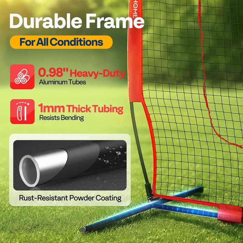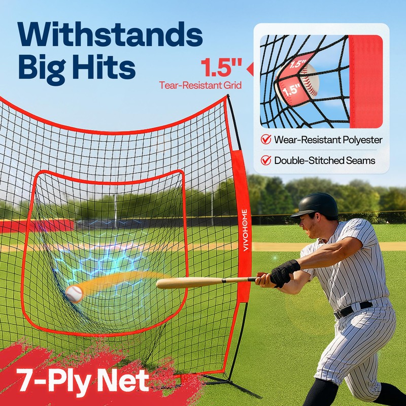 - STURDY CONSTRUCTION - The frame of this VIVOHOME baseball practice net is made of heavy-duty iron with a black powder-coating, while the tube diameter is 0.98” with a thickness of 0.8”; It is durable and not easy to be deformed; The 7-ply knotless polyester netting provides superior wear-resistance when batting and pitching into the net