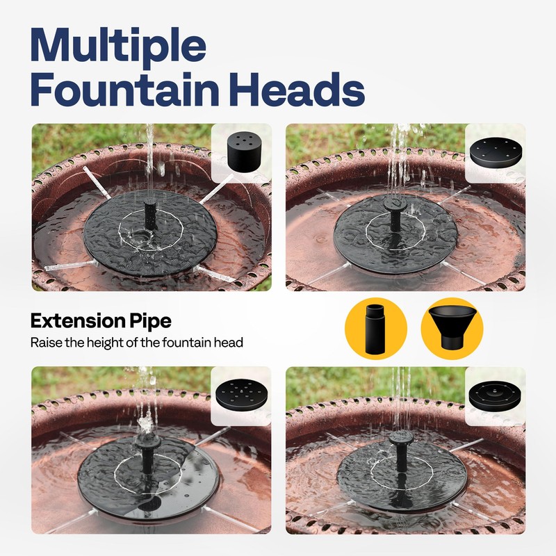 - COMBO SET: This package includes a 5-forked bird bath, a 1.4 W solar water fountain, and four different spray nozzles; The fountain can be configured to create a beautiful display with four different patterns, which may attract and entertain birds; The bird bath set is a suitable and lovely addition to any garden, patio, yard, deck, or other outdoor space