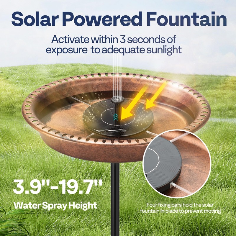 - DURABLE CONSTRUCTION: The VIVOHOME birdbath has a sturdy 5-forked metal base with a black-coated finish that keeps it upright and resistant to bending or breaking; The birdbath tray is made of high-quality PP material and is covered with a bronze coating, making it wear and crack-resistant and weatherproof, so there is no need to worry about rain or sun damage; The solar-powered fountain and 4 spray nozzles are designed with PP material, which gives it a longer service life