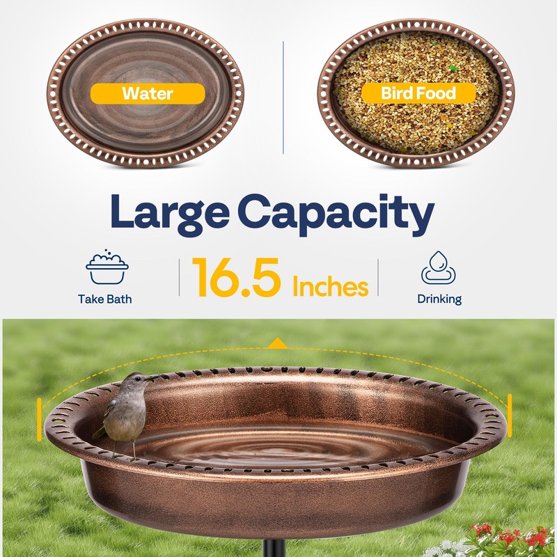 - LARGE CAPACITY: This extra-large bird bath features an oval tray with tiny holes along the borders, offering a stable standing and resting area for your feathered companions; The bird bath has a capacity of 1.3 gallon and a diameter of 16.5 in, which will hold enough water or food for your wonderful birds and butterflies to enjoy; A depth of 3.5 in is sufficient to accommodate the equipped solar fountain pump, ensuring optimal functionality (Bowl dimensions: 16.5 x 12.6 in, bowl depth: 3.5 in)