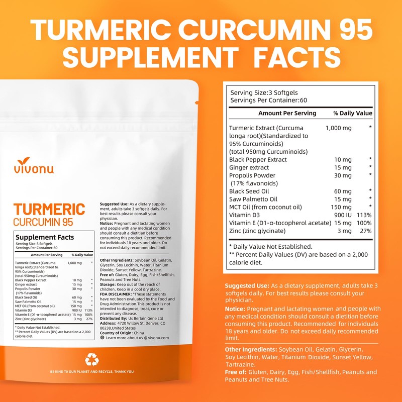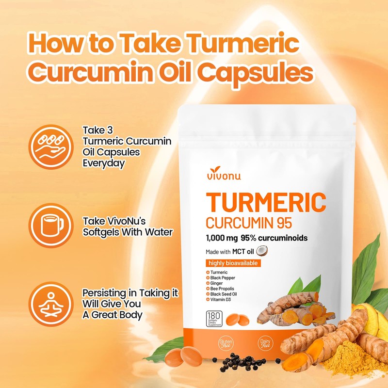 VivoNu Turmeric Curcumin Supplement with Black Pepper Capsules, 1000mg Pure Turmeric Curcumin 95% Curcuminoids Softgels, Enhanced Absorption, Joint Support, Non-GMO, Gluten-Free