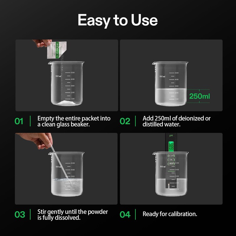 - Simple to Use: Compatible with any pH tester and probe; Just empty a packet into a clean glass beaker, add 250ml deionized or distilled water, stir gently until dissolved, and you're ready for calibration