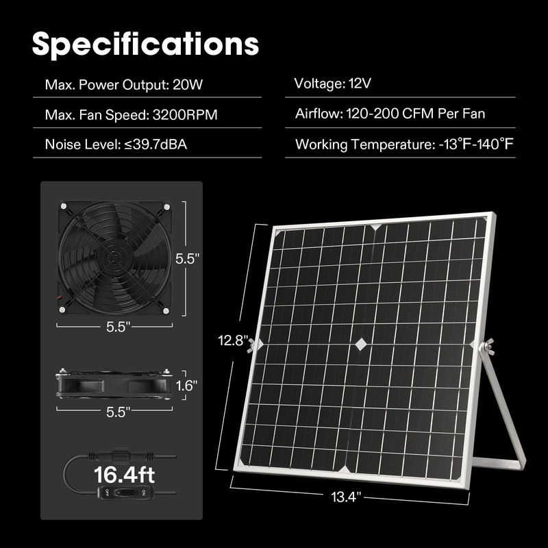 - Solar-Powered High-Efficiency Fans: The two fans are powered entirely by the 20W solar panel, providing an energy-efficient and cost-saving solution; Utilizing brushless induction motors with oil-impregnated bearings, the fans deliver powerful, quiet performance with speeds reaching 3200RPM