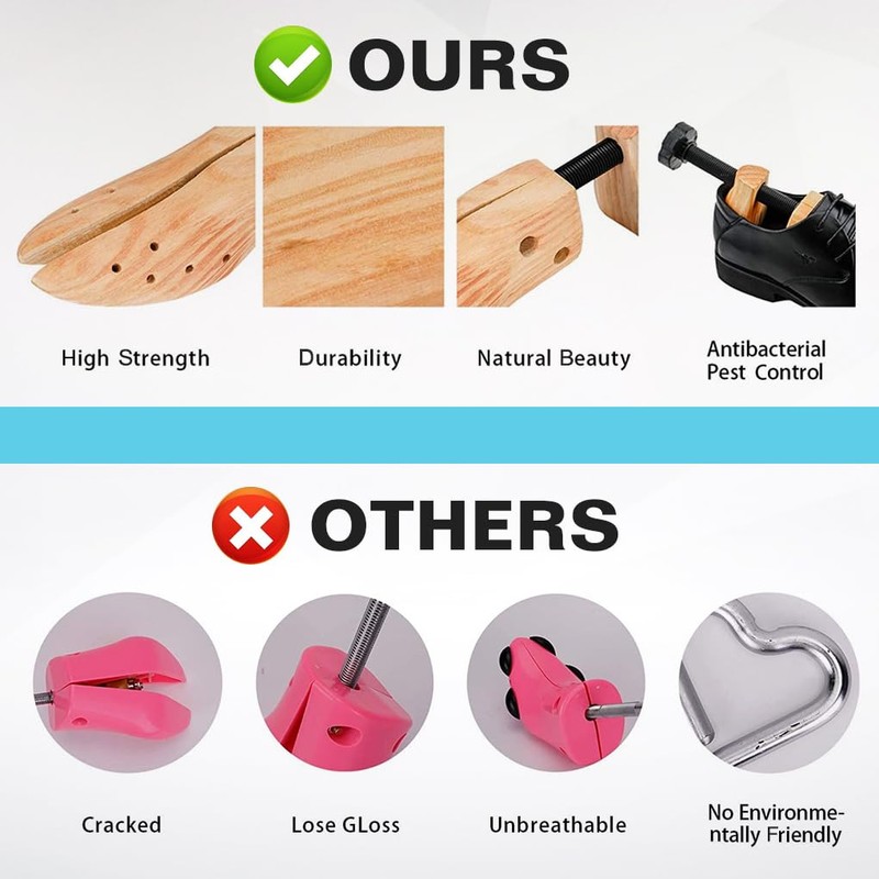 - Universal Usage: Ideal for breaking in new shoes or loosening up old ones, this wooden shoe tree works great with sandals, flats, heels, sneakers, leather shoes, oxfords, canvas shoes, and more. Whether you're using it as a shoe stretcher women love, a shoe widener, or a shoe expander for boots, it's compatible with leather, suede, and other natural materials.