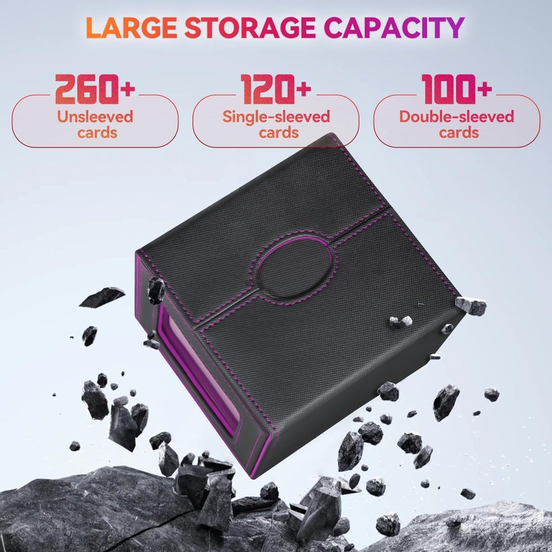 - Large Storage Capacity: This card deck box features an innovative horizontal layout, easily accommodating over 100 double-sleeved cards, 120 single-sleeved cards, or 260 unsleeved cards. The U-shaped wide mouth ensures easy card retrieval during gameplay, offering convenience and peace of mind.