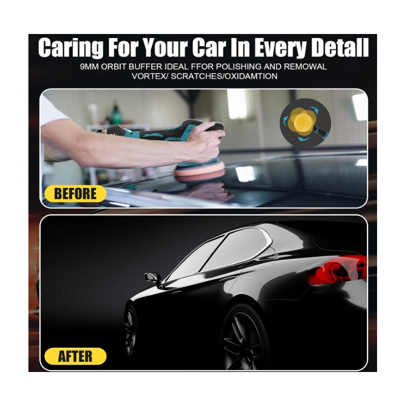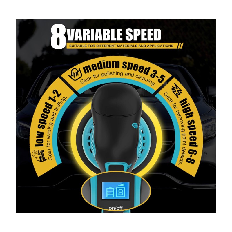 • 🚐🚐UPGRADE BRUSHLESS MOTOR& 8-SPEED ADJUSTMENT- Dual action polisher has a built-in high-efficiency Brushless Motor, low noise, power, enhanced performance which can provide a maximum speed of 5500 RPM. With 6-speed settings available, you have the flexibility to adjust the buffing machine according to your needs. Whether it's the low speed for gentle waxing and buffing, medium speed for thorough polishing and cleaning, or high speed for removing stubborn defects and oxidation, this orbital polisher has you covered.
