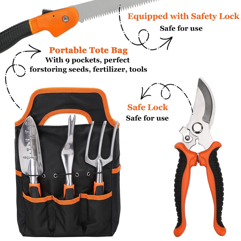 VKIZIKV Garden Tools Set, 9 Piece Aluminium Alloy Heavy Duty Garden Tool Set, with Non-Slip Rubber Grip, Storage Tote Bag, Gardening Tool Kit, Gardening Tools Set for Women Men (Orange)