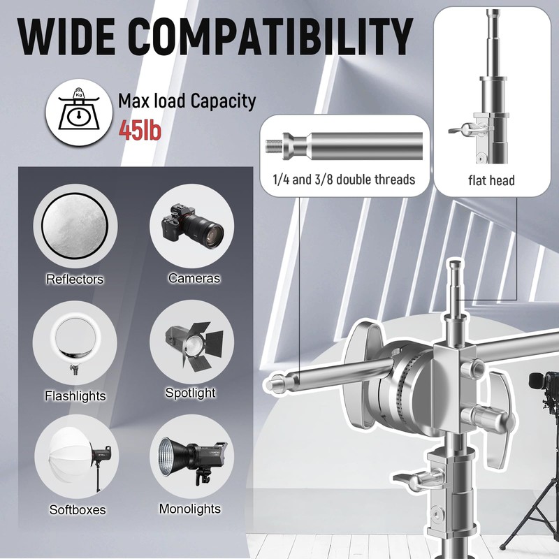 - Adjustable Configuration: Featuring a 10.8ft heavy duty light stand with 4.2ft boom extension. Easily adjusts to various angles with dual 5/8" baby pin attachments and secure locking knobs.