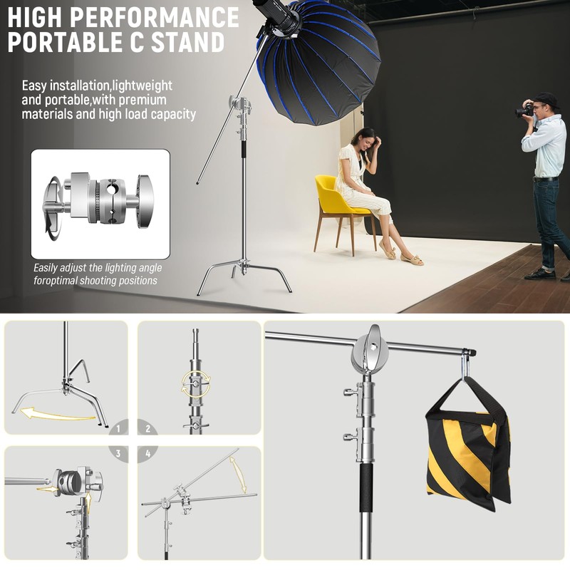 - Multi-Purpose C Stand: Professional photography light stand with detachable boom arm system. Ideal for studio lighting, backdrop support, and equipment mounting with maximum versatility.