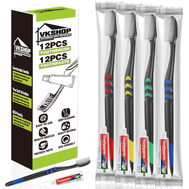 VKshop 12 PS Bulk Disposable Toothbrushes with Toothpaste, Individually Wrapp...