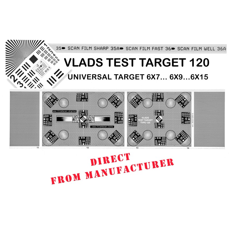 - Vlads Test Target comes in variety of film formats (35 mm, MF type 120, 4x5" , mounted 35 mm slides) and is produced using the finest grained film currently available, which ensures high-quality results. We offer a full range of options to suit your specific needs.