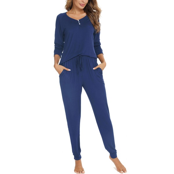 Vlazom Pyjamas Set for Women, Super Soft Pj's Sets Long Sleeve Tops and Pants Ladies Pyjamas Set with Pockets,A-Cobalt Blue,L