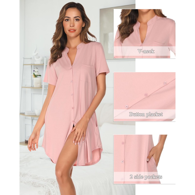 Vlazom Women's Nightdress Turn-Down Collar with Buttons Short Sleeve Nightdress with Chest Pocket, Style B-pink