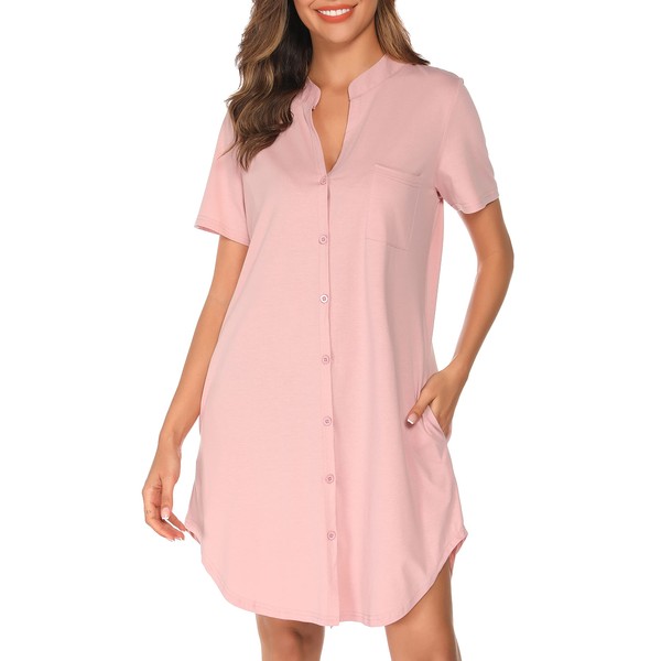 Vlazom Women's Nightdress Turn-Down Collar with Buttons Short Sleeve Nightdress with Chest Pocket, Style B-pink