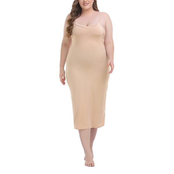 Vlazom Women's Plus Size Full Slip Dresses Petticoat Adjustable Spaghetti Strap Under Dresses Long Nightgown V-Neck Cami Dress Nude,1XL