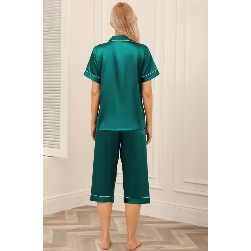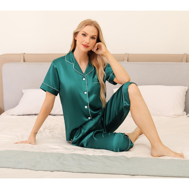 Vlazom Women's Pyjamas Sets, Silk Pj's Set Short Sleeve Button Down Top and Capri Lounge Set Soft Satin Loungwear Sleepwear Dark Green,L