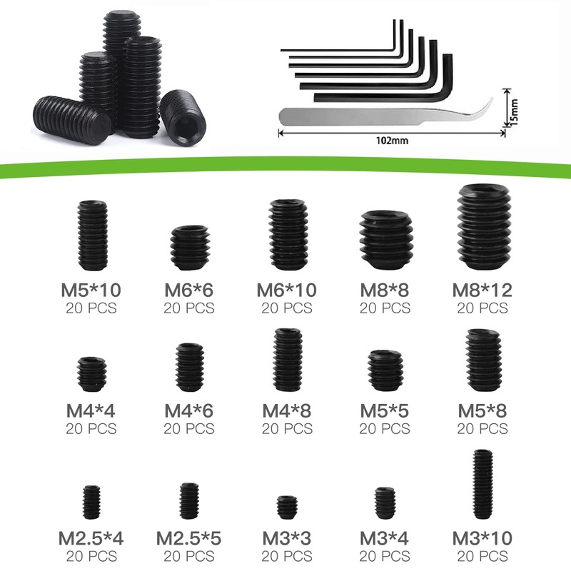 • Hex Screw Set with Socket Hole Package Detail: Imo screws M2.5, Imo screws M3, Imo screws M4, Imo screws M5, Imo screws M6, Imo screws M8 are 20 products. 6 x Hex Wrench Total of 300 set screws in 6 sizes. Popular Father's Day gift