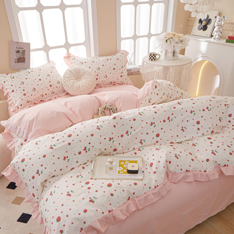 VM VOUGEMARKET Ruffle Comforter Set with Strawberry Prints,Kawaii Bedding Comforter Set,1 Down Alternative with 2 Lace Pillow Shams for All Seasons-90 x90