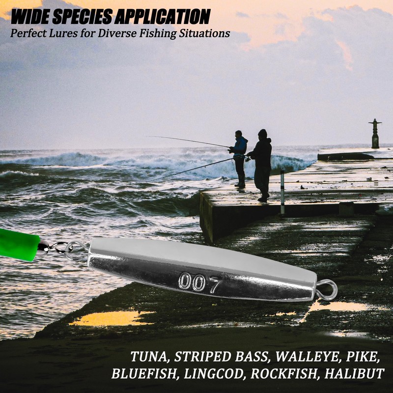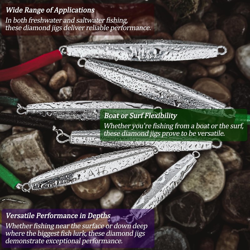 • 【Deadly Attraction Saltwater Fishing Jigs】VMSIXVM diamond jigs lure crafted from high quality materials provide brilliant flash in water. More reflective surfaces attract fish and make them strike. PVC tube split like eel motion wobbles within the water mimics the movement of a desperate fish trying to get away from being eaten, which incites the predator instinct to chase it down and eat it, enhancing your fishing success.