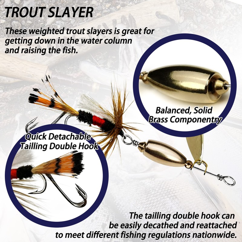- 【Deadly Attraction Trout Spinners】The hand tied fly represents a favorite food source will causes an instinctive strike. Polished spinnerblade creates a flash which grabs the trouts attention. The sharpest double hook works in tandem with the main hook to yeilds a firmly hooked fish.