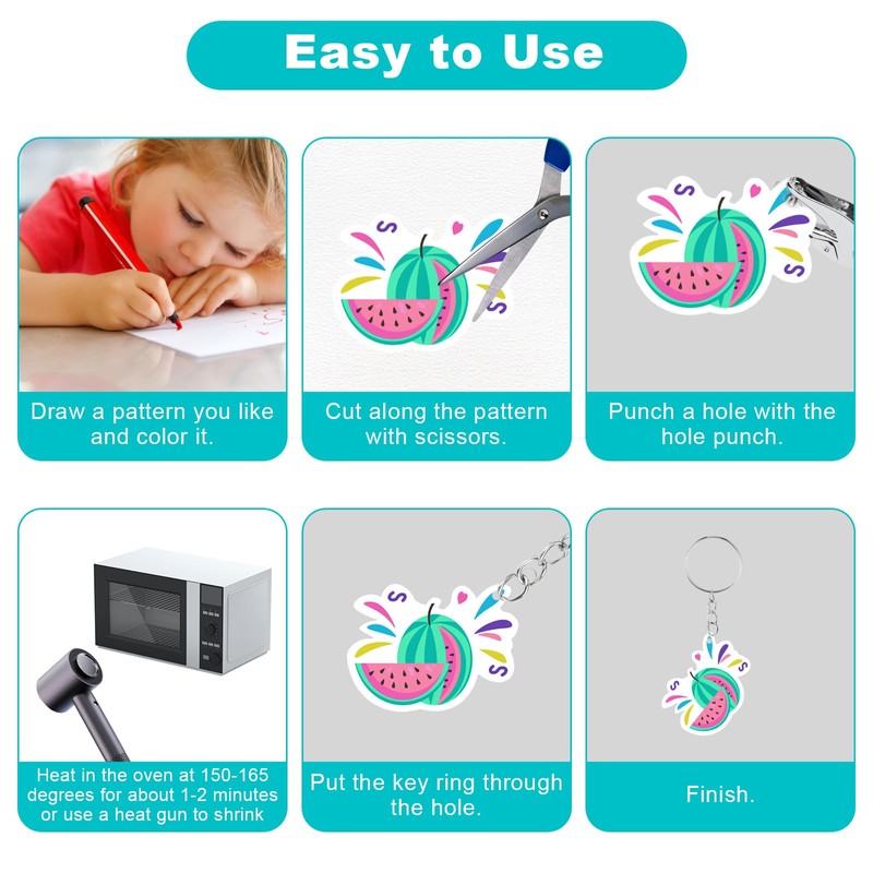- Wide application: shrink film kits are not only suitable for making personalised key chains, but can also be used for a variety of crafts such as pendants, earrings, jewellery tags, gift tags, animal tags, bookmarks, zip tags and decorations. You can make different DIY crafts with your children.