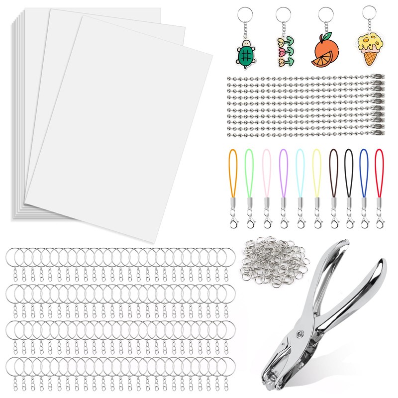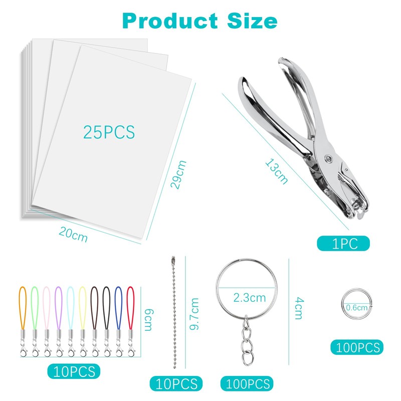 - Value package: the set contains 25 sheets of empty shrink film with a size of 20 x 29 cm, 100 key rings, 100 open rings, 10 carabiner hooks, 5 bead chains and 1 hole punch. Lots of accessories to make many key rings or jewellery pendants, perfect craft kit for beginners and advanced users.