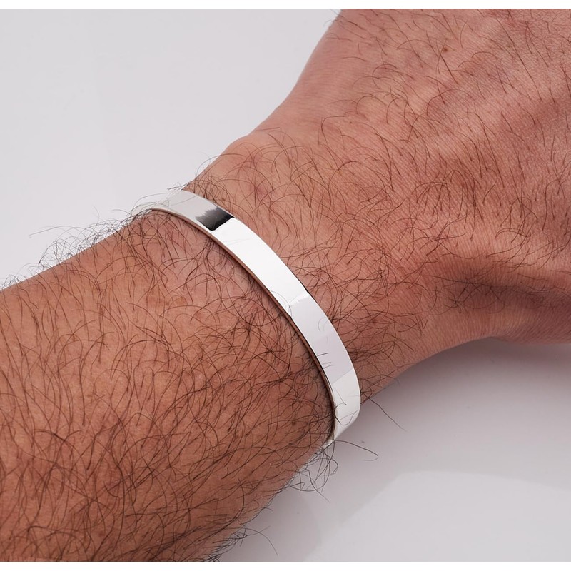 This statement men's silver bangle bracelet is made from quality solid 925 silver. Measure from end to end is 17cm. Width: 8mm Weight 22.5grs 925 silver hall marked, One size fits most wrist size from 18cm to 22cm very simply with a gentle squeeze to adjust the size. Presented in a beautiful jewellery gift box. It makes a great gift for him. Idea for Christmas gift, anniversary gift, mother's day gift, birthday gift, valentine's gift and much more.