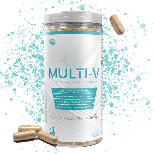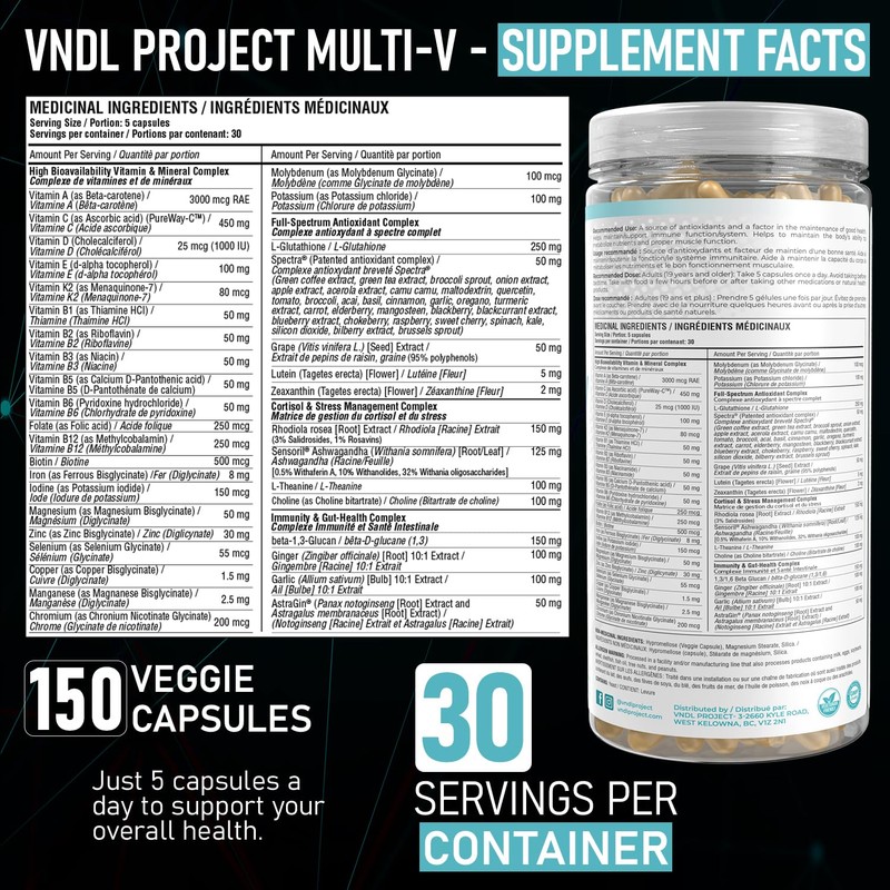 VNDL Project VNDL Project Multi-V Multivitamin For Men & Women - 65 Vitamins, Minerals, Fruits, Vegetables & Herbs - Supports Gut Health, Cortisol Manager & Antioxidant Complex - 30 Serving Bottle/150 Capsules