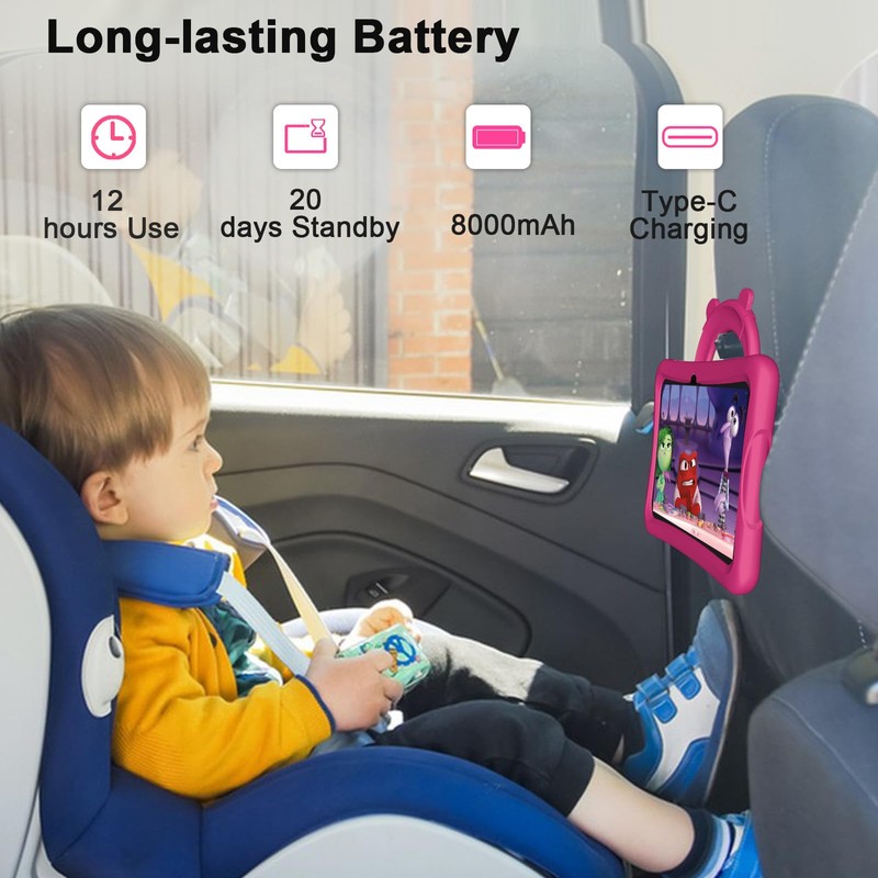 - LONG-LASTING BATTERY: The 8000mAh battery provides up to 12 hours of continuous use, making this kids tablet ideal for long trips and uninterrupted play sessions. Perfect for keeping your child entertained during long car rides or flights.