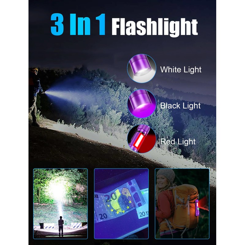 - 🔦[3 in 1 LED Flashlight]: Rechargeable Flashlight+UV Flashlights+Magnetic COB Tool Light. 395NM UV flashlight-Tactical flashlights provide 395NM black light, which is perfect for detecting what naked eye can not see. It can show invisible stains and liquids, hunt for scorpions at night, also check counterfeit ID, currency.