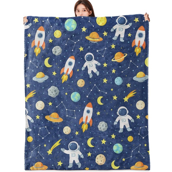 vnlvnl Space Blanket Lightweight Flannel Blankets Gifts for Adults with Astronaut Rocket Planet Star Moon and Constellation Pattern Printed Throw for Couch Chair Office Bedroom Decor, 60x50inch