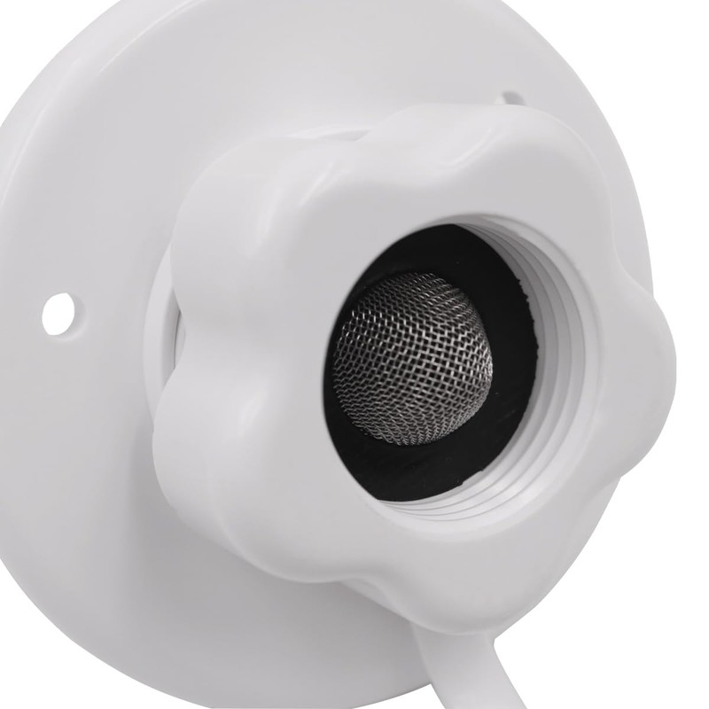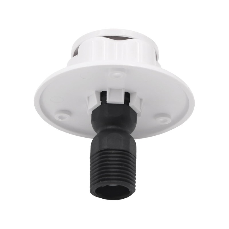 - The water inlet is white, connection to 1/2 inch threaded pipe on the inside, flange has 2-3/4 inch diameter