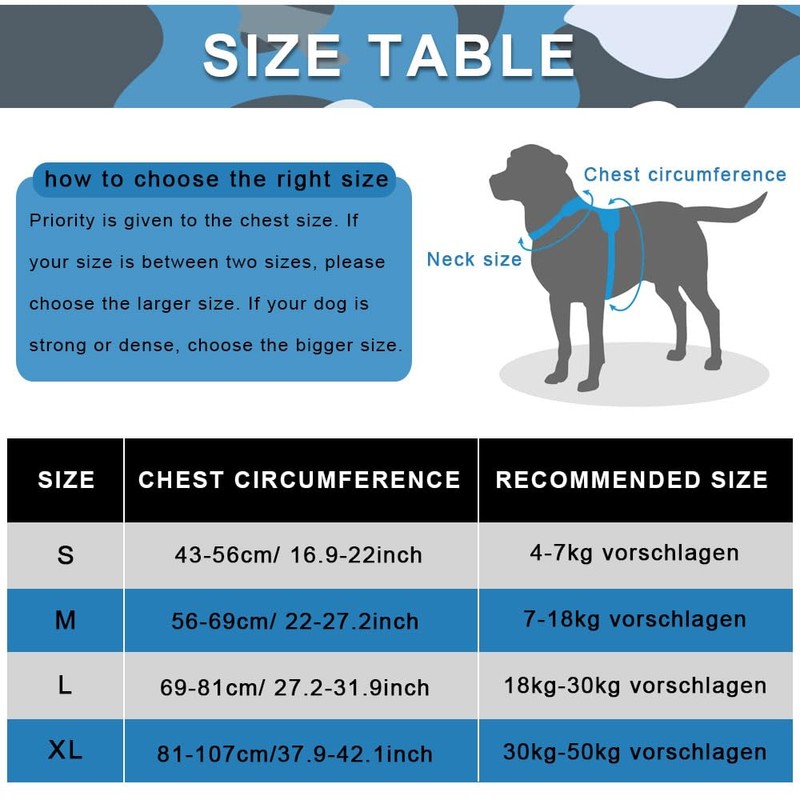 HOW TO CHOOSE THE RIGHT SIZE: Priority is given to the chest size. If your size is between two sizes, please choose the larger size. If your dog is strong or dense, choose the bigger size.