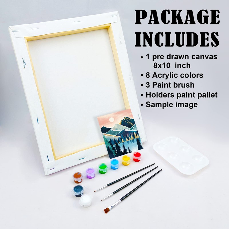 • Package: 8x10 Pre Drawn Stretched Canvas, 8 Acrylic Colors, 3 Paint Brush, Pallet, Sample image.