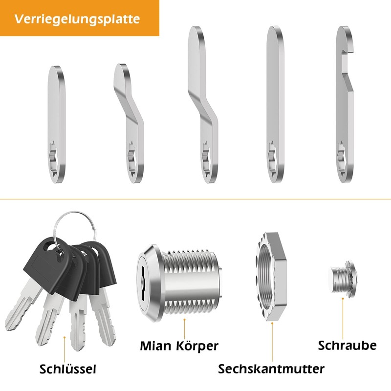 Package includes: 1 x cam lock, 4 x double-sided keys, 5 x different lock plates.