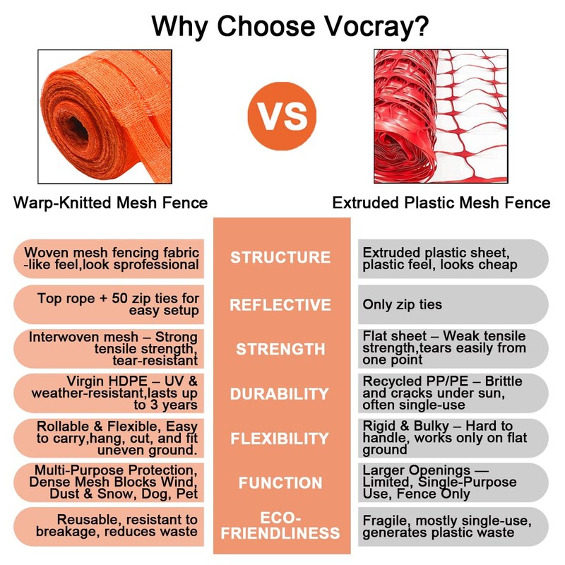 - 【Upgraded Warp-Knitted Mesh】: Our orange safety fence is made from warp-knitted HDPE, offering a fabric-like texture that’s soft, flexible, and tear-resistant. Unlike stiff, brittle extruded plastic mesh made from recycled materials, this fence is easy to roll, cut, and shape to fit complex terrain like slopes or corners. It looks clean and professional, withstands sun and wind, and can be reused season after season—ideal for temporary barriers, dog fence, garden fence, snow fence, and more.