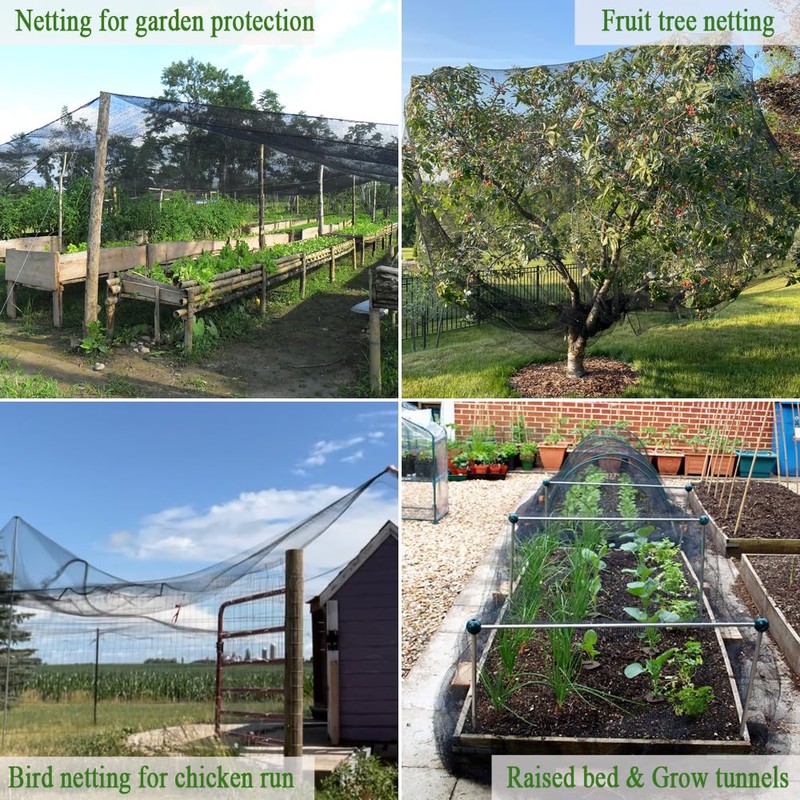 - Bird netting for garden: Bird netting is a widely used for gardens, farms, and planting processes. Whether you're growing blueberries, strawberries, tomatoes, cherries, vegetables, flowers, figs, or fruit trees, this anti bird netting is perfect for protects your crops and harvest from hungry birds, deers, rabbits, and other small animals. Acts as bird netting for chicken coops, keeping predators out while preventing chickens from escaping.