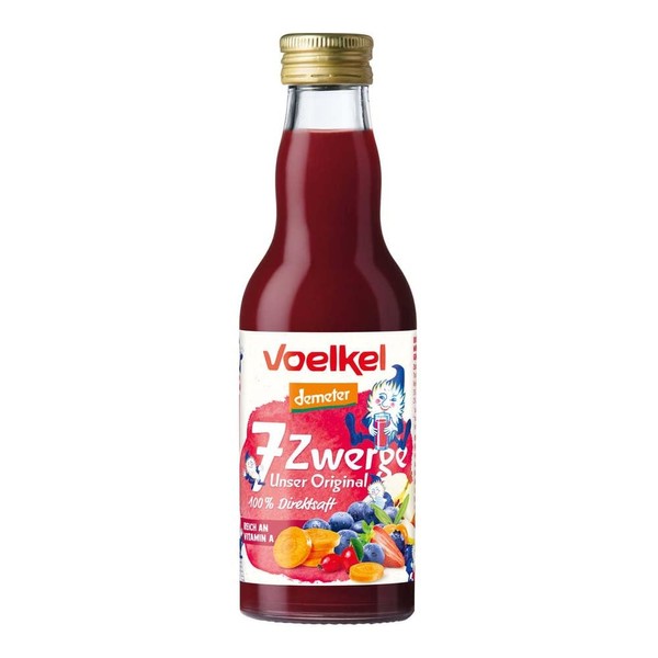 The favourite juice for young and old. The 7 dwarf juice is optimally adapted to the child's taste and has natural sweetness without the addition of sugar. The 7 dwarf children's juice from Voelkel is specially designed to meet the needs of the growing child. With 85% fruit and 15% carrot juice, it is optimally adapted to the child's taste and has natural sweetness without the addition of sugar. Ingredients: grape juice**, apple juice**, carrot juice**, pear juice*, blueberry juice*, strawberry pulp*, rosehip pulp*, sea buckthorn pulp*. *From controlled organic cultivation, **from controlled bio-dynamic cultivation, diet and allergy sufferers. Information: free from gluten, free from yeasts, free from milk protein, unsweetened. Nutritional values based on 100 ml: energy KJ / kcal: 222 KJ / 53 kcal protein: 0.3 g carbohydrates: 11.9 g fat: 0.09 g bread units: 0.98 BE fibre: 0.2 g sodium: 0.002 mg control point: DE-ÖKO-0. 07 | PV
