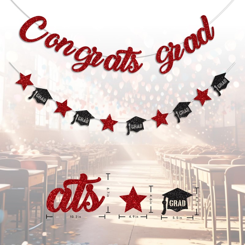 - Great congratulations graduate banner class of 2025 decorations.You will get the graduation banner red in 2strings---congrats grad banner and 1string star and graduation cap garland banner,perfect red and black graduation decorations.