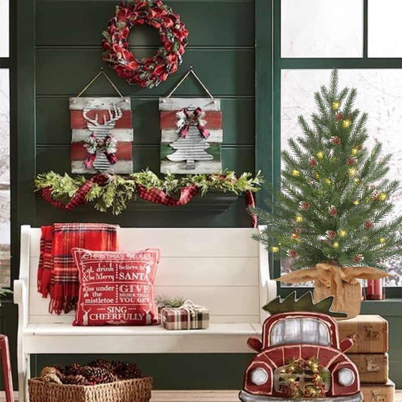 Vofuly 2 Ft prelit Tabletop Mini Christmas Tree with 50 LED,Small Frosted Lighted Artificial Pine Tree with Burlap Base,Pinecone Decoration,2 FT Miniature Farmhouse Xmas Tree Decor for Farmhouse Door