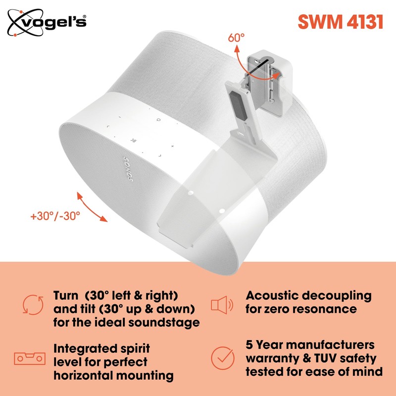 Vogel's SWM 4131 speaker wall bracket for Sonos ERA 300, Max. 11 lbs (5 kg), Tiltable -30º/+30º, Swivels up to 60º (left/right), White, 1 bracket