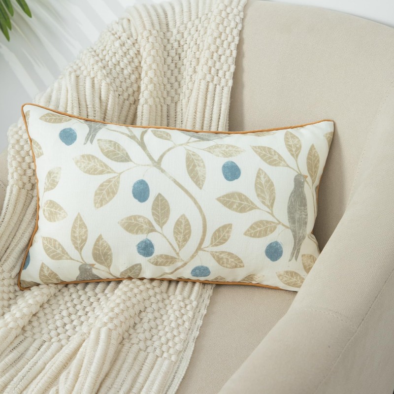 VOGOL Linen Textured Throw Pillow Cover, 12 x 20 Inch Farmhouse Throw Pillowcase, Beige Birds & Leaves Lumbar Pillowcase for Couch Bed Room, 1 Piece Pack with Piping Trim