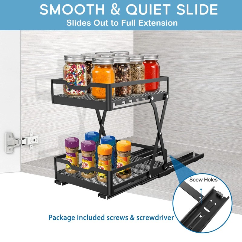 VOGWOLTH Collapsible Double Tier Slide Out Spice Rack with Height Adjustable. Do you need extra space to store your spices or are tired of not being able to find anything in a mess of cans or bottles? Then stop searching because this pull out spice organizer is the perfect solution for you