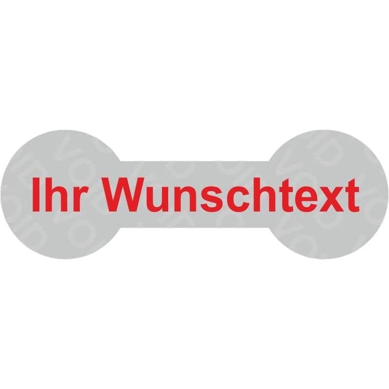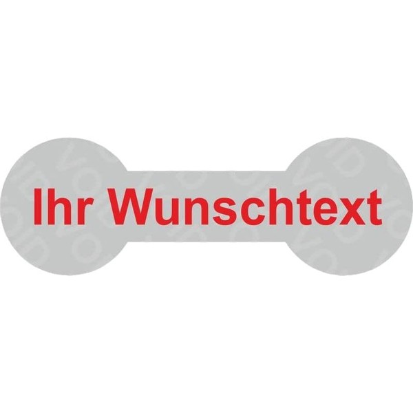 When removing this security label, the term "VOID" (invalid/devalued) appears on the surface as well as on the adhesive label. Thus, manipulation is immediately visible. Can be used for sealing equipment, packaging, cabinets, documents, envelopes and much more. Label size: 60 x 20 mm (bone shape), web width: 46 mm, sleeve: 50 mm, roll winding: outside, roll outer diameter: 100 mm, quantity: 2 x 500 labels per roll (2 rows), material: polyester safety film VOID, silver, print: printed with your desired text (e.g. logo, barcode or sequential number are also possible) in red, blue or black. send us our printed text (with font and font size). Then you will receive a correction print from us. After your release, the labels are made. If you have any questions, please feel free to contact us.