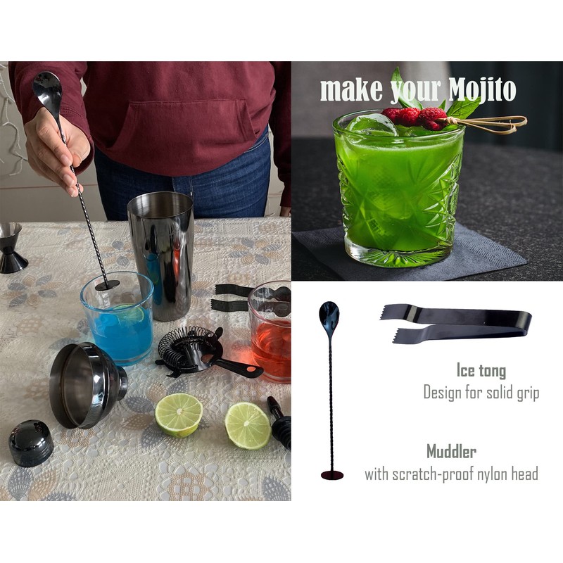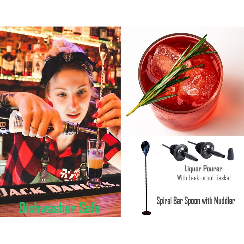 - * SUPERIOR QUALITY. All bar tools are made with rustproof Stainless Steel and high-quality coating. All tools are food safe. Comes with a beautiful gorgeous leakproof cocktail shaker. All welds are strong and beautiful. NOTE: Thoroughly wash before first use. As with any plated stainless steel, the finish is susceptible to scratching. Please handle with care. Hand wash all tools and dry with a soft cloth.