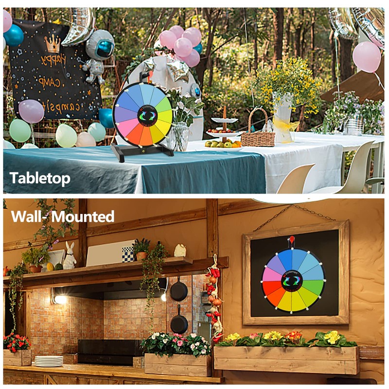 - Multi-purpose: The spinning wheel for prizes can be hung on the wall or placed on the table for parties, carnivals, trade shows, corporate events, family games, classrooms and holiday events, etc.
