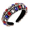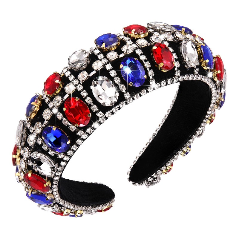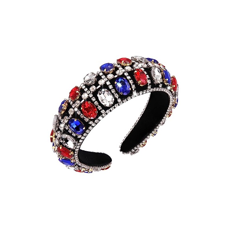 - ¡Cómprate a la reina de la fiesta del 4 de julio usando una diadema acolchada con diamantes de imitación! El accesorio de disfraz del 4 de julio está hecho de abalorio de vidrio rojas, blancas y azules, acolchado de terciopelo negro hace que sea cómodo de llevar, ancho de la diadema de diamantes de imitación en el punto más ancho del centro de 1.5 pulgadas. Diámetro aproximado de 16 cm. Utiliza esta diadema de fiesta patriótica para complementar el resto de tu atuendo patriótico