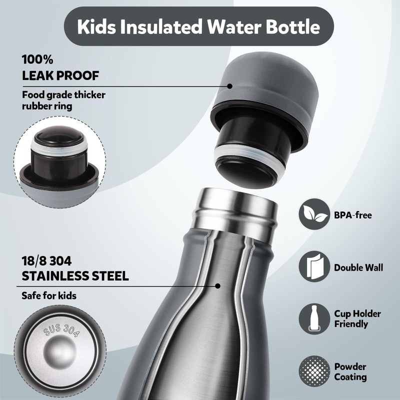 - 【Safe, Strong & Super Portable】 BPA-free and rustproof, our small kids insulated water bottle keeps drinks tasting great. The 12 oz size fits just right in lunch boxes, and backpacks—hydration made easy